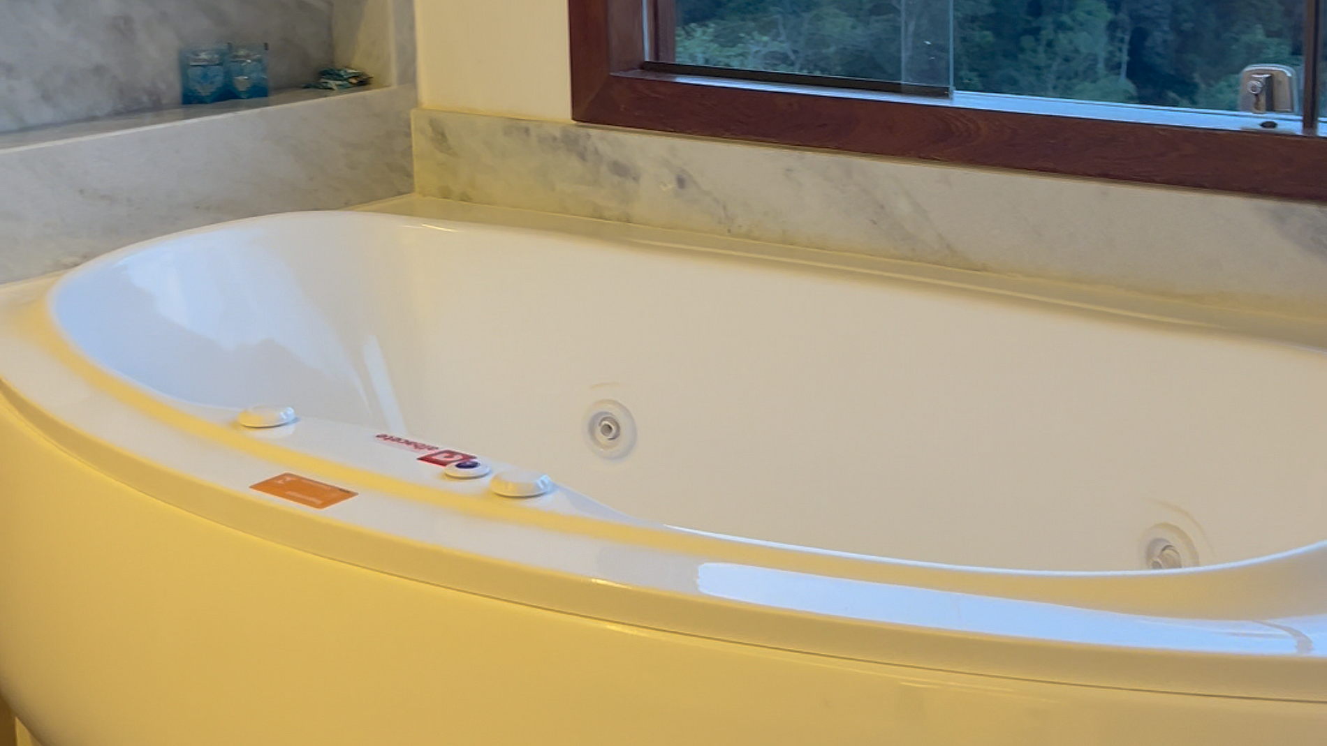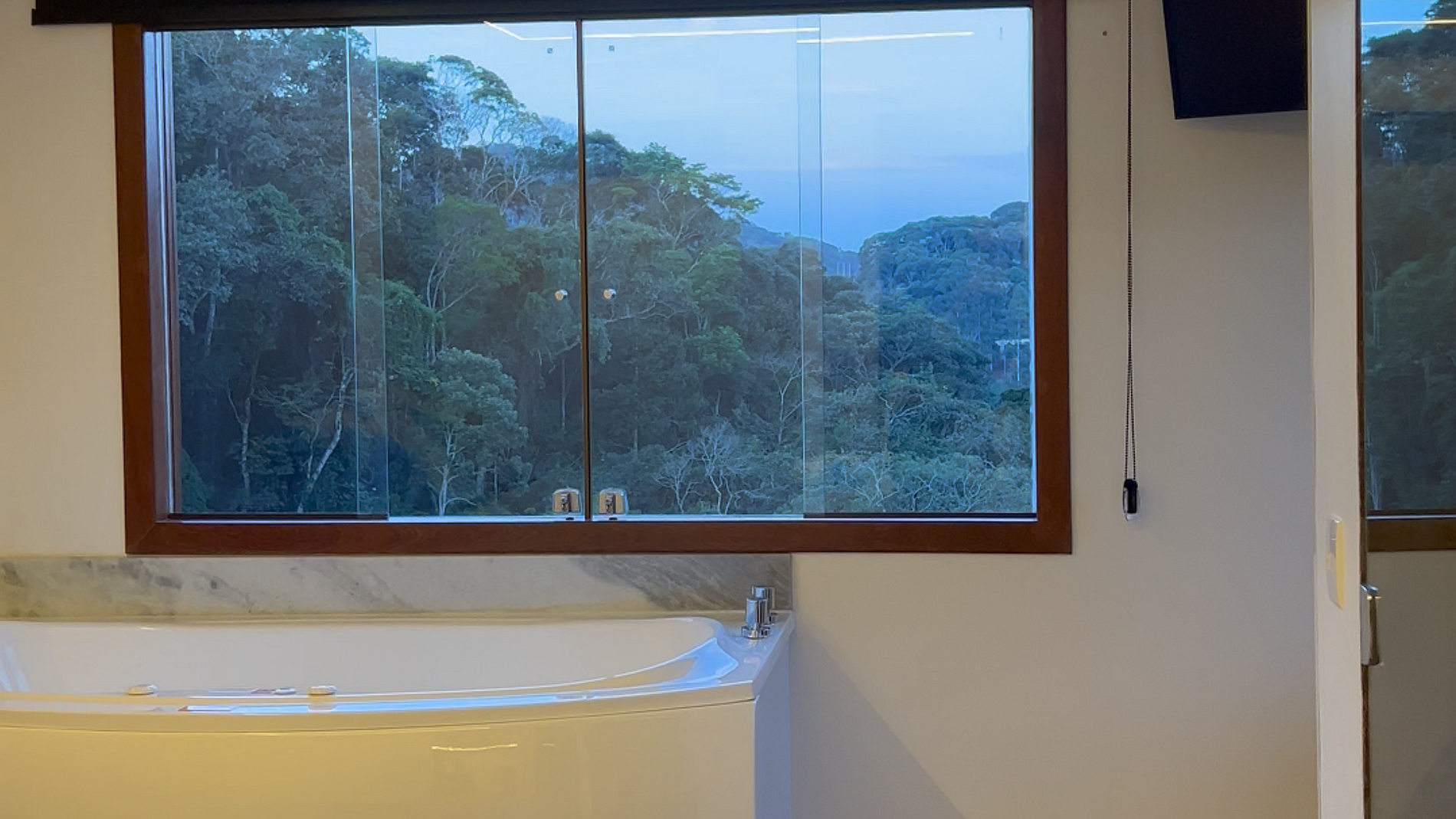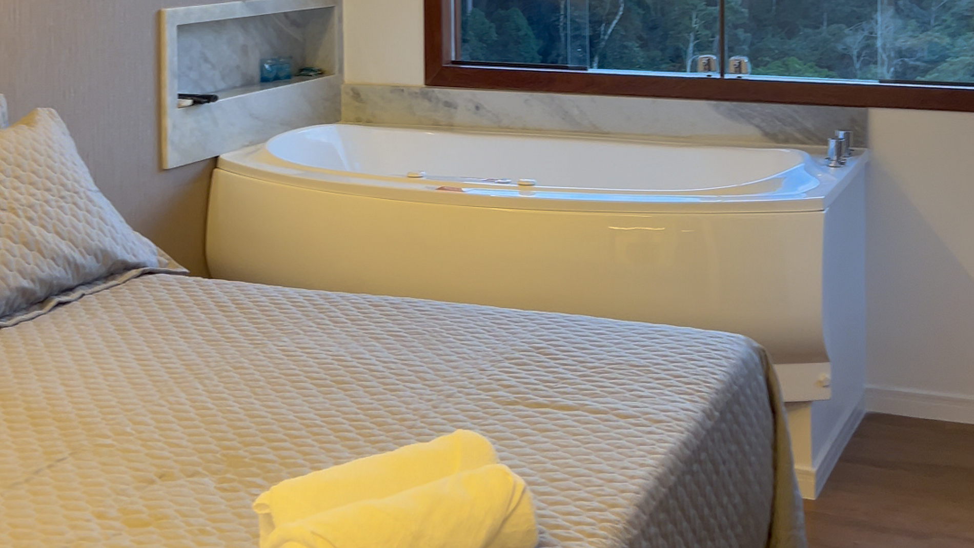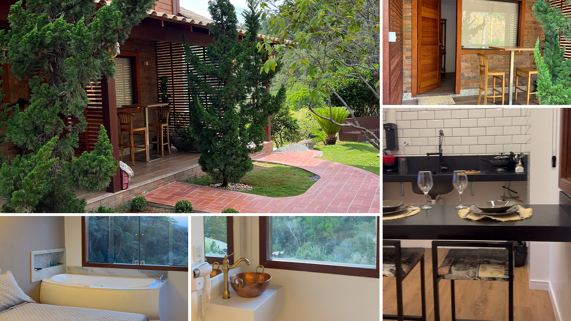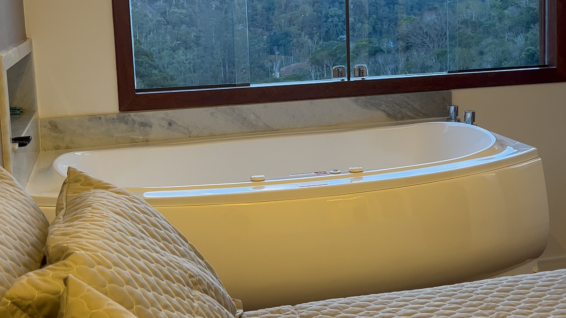 A Cabana Beija-Flor destaca-se pela combinação de charme e tranquilidade no meio das montanhas de Domingos Martins. A hidromassagem ao lado da cama oferece um toque especial de conforto e romantismo, criando uma atmosfera única para casais. A vista panorâmica das montanhas, visível diretamente da cama, envolve os hóspedes em uma experiência de total conexão com a natureza.