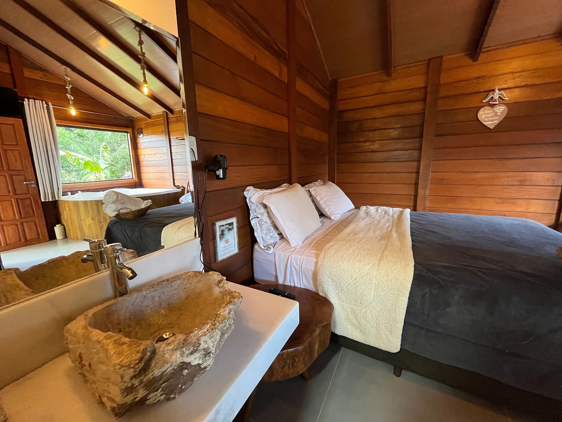 Um espaço super aconchegante e único. Rodeado pela mata atlântica, pássaros e muita natureza. Todas as Cabanas Possuem: • Cama queen; • Banheiro; • Hidromassagem; • Varanda; • Fogo de chão ( fornecemos Lenha e acendedores); • Roupa de Cama e Banho; • Roupão de Banho; • Ar Condicionado Quente e Frio; • Cozinha Equipada com : (Airfryer, cooktop, cafeteira, frigobar, taças, panelas, talheres, filtro de barro. Fornecemos Pó de Café, Açúcar, Sal, adoçante, óleo); • TV Sky com canais liberados (TELECINE, HBO, NETFLIX); • Wi-Fi • Estacionamento privativo.⁣⁣⁣